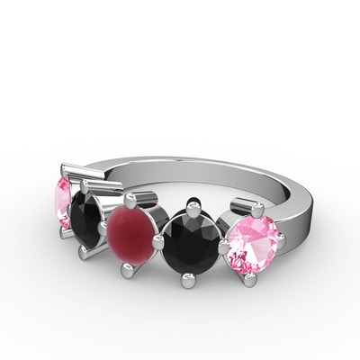 Kök yakut, siyah zirkon ve pembe kuvars 14 ayar beyaz altın yüzük