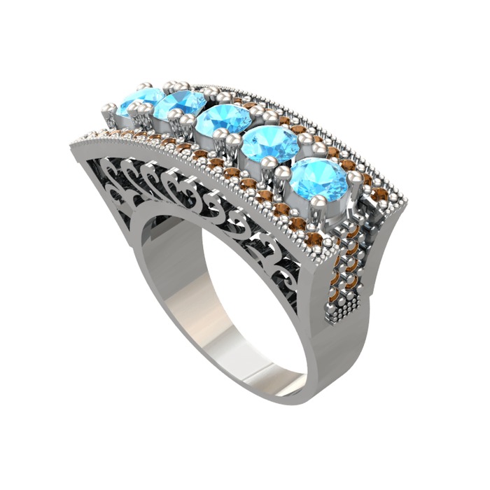 Akuamarin ve dumanlı kuvars 8 ayar beyaz altın yüzük