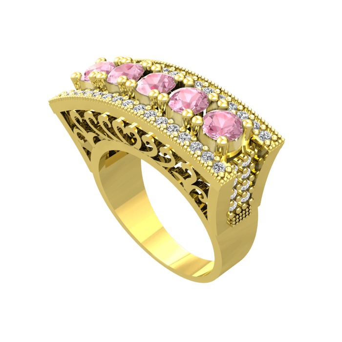 Pembe kuvars ve beyaz zirkon 18 ayar altın yüzük