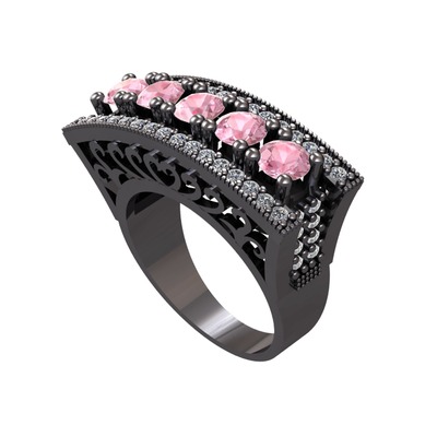 Pembe kuvars ve pırlanta 925 ayar siyah rodyum kaplama gümüş yüzük (0.72 karat)