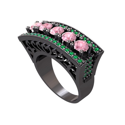 Pembe kuvars ve yeşil kuvars 925 ayar siyah rodyum kaplama gümüş yüzük
