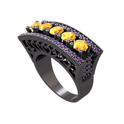 Sitrin ve ametist 925 ayar siyah rodyum kaplama gümüş yüzük