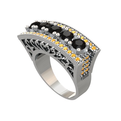 Siyah zirkon ve sitrin 14 ayar beyaz altın yüzük