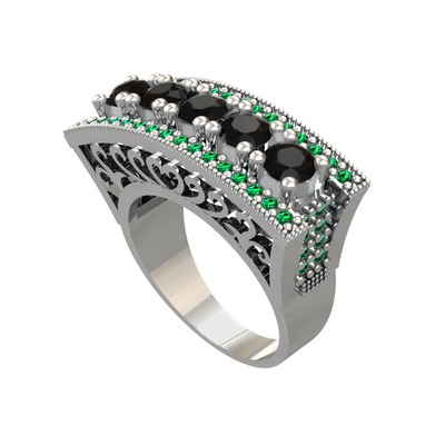 Siyah zirkon ve yeşil kuvars 8 ayar beyaz altın yüzük
