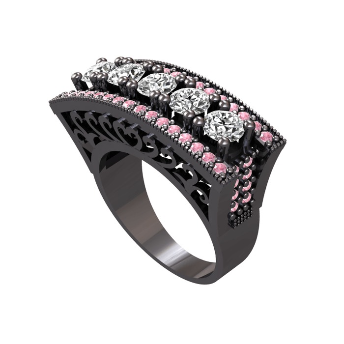 Swarovski ve pembe kuvars 925 ayar siyah rodyum kaplama gümüş yüzük