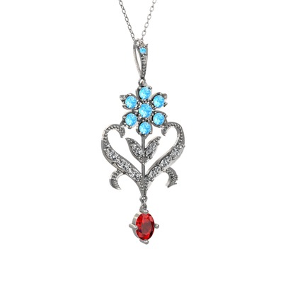 Akuamarin, beyaz zirkon ve garnet 925 ayar gümüş kolye (40 cm beyaz altın rolo zincir)