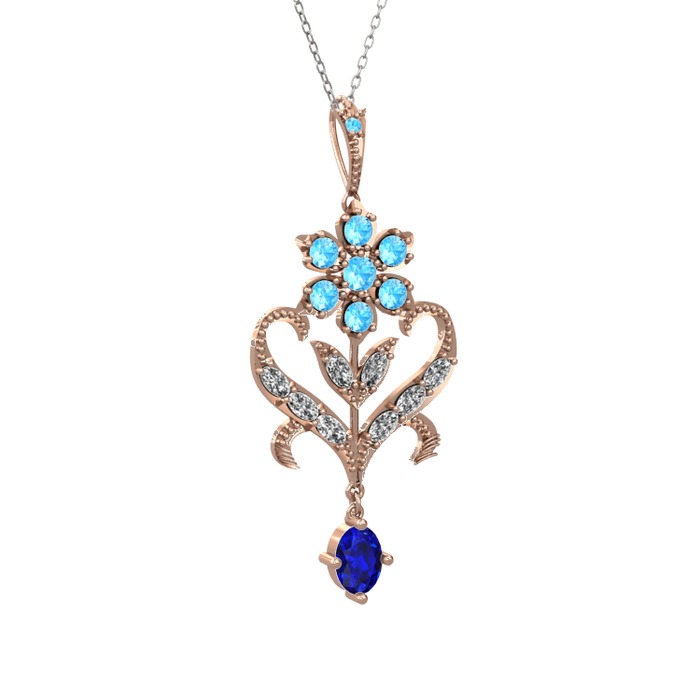 Akuamarin, beyaz zirkon ve lab safir 14 ayar rose altın kolye (40 cm gümüş rolo zincir)