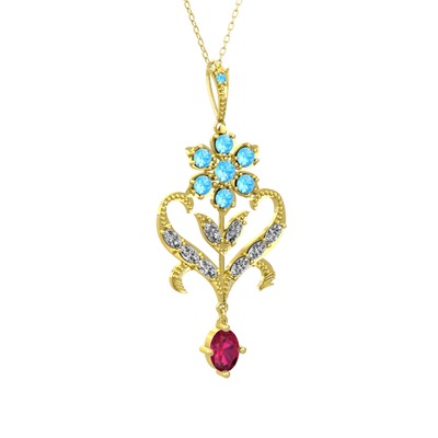 Akuamarin, beyaz zirkon ve rodolit garnet 8 ayar altın kolye (40 cm altın rolo zincir)