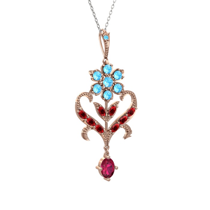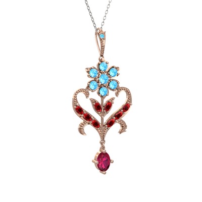 Akuamarin, garnet ve rodolit garnet 14 ayar rose altın kolye (40 cm beyaz altın rolo zincir)