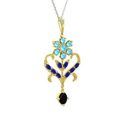 Akuamarin, lab safir ve siyah zirkon 925 ayar altın kaplama gümüş kolye (40 cm gümüş rolo zincir)