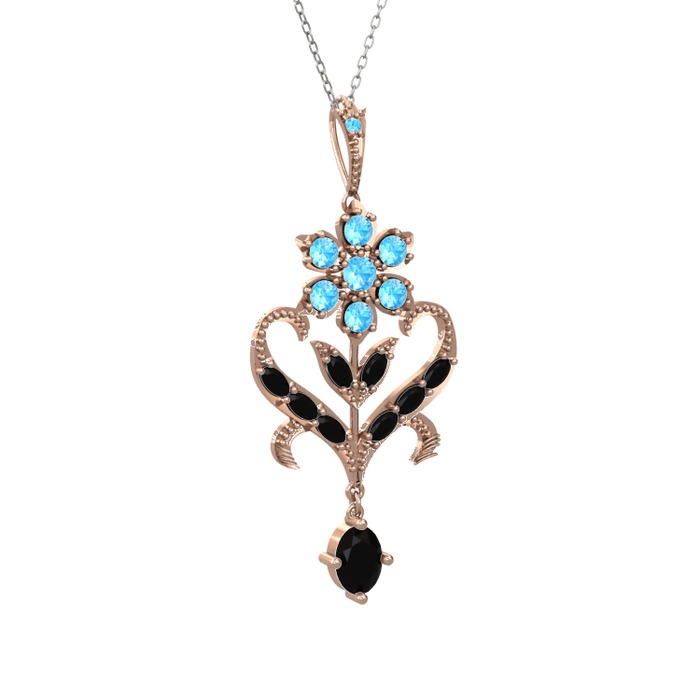 Akuamarin ve siyah zirkon 925 ayar rose altın kaplama gümüş kolye (40 cm beyaz altın rolo zincir)