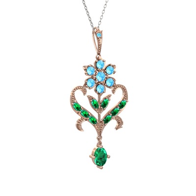 Akuamarin ve yeşil kuvars 14 ayar rose altın kolye (40 cm beyaz altın rolo zincir)