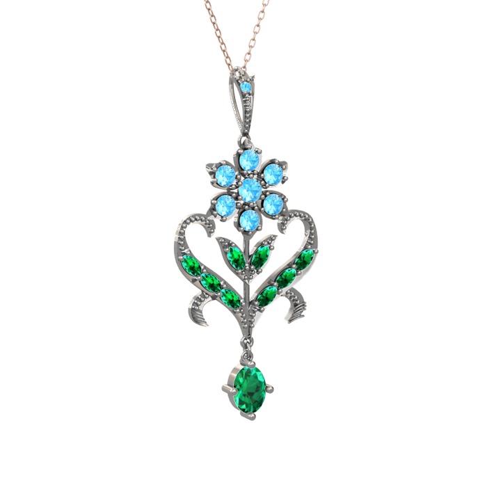 Akuamarin ve yeşil kuvars 925 ayar gümüş kolye (40 cm gümüş rolo zincir)