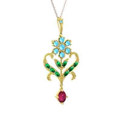 Akuamarin, yeşil kuvars ve rodolit garnet 925 ayar altın kaplama gümüş kolye (40 cm rose altın rolo zincir)