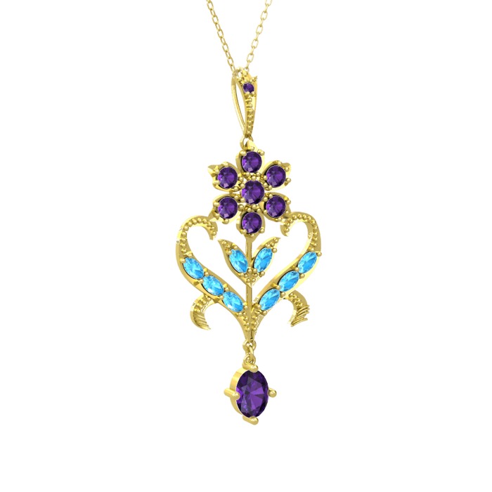 Ametist ve akuamarin 14 ayar altın kolye (40 cm altın rolo zincir)