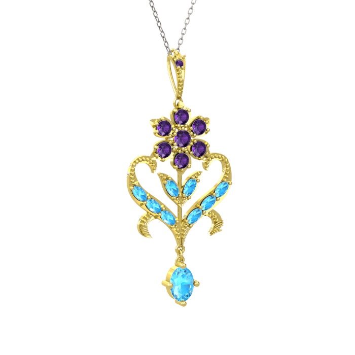 Ametist ve akuamarin 14 ayar altın kolye (40 cm beyaz altın rolo zincir)