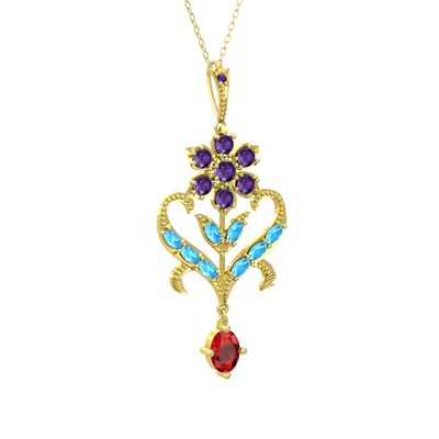 Ametist, akuamarin ve garnet 925 ayar altın kaplama gümüş kolye (40 cm gümüş rolo zincir)