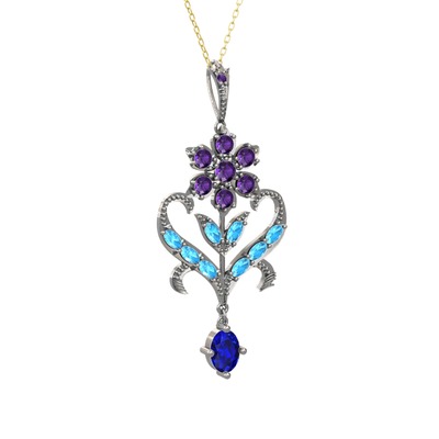 Ametist, akuamarin ve lab safir 8 ayar beyaz altın kolye (40 cm gümüş rolo zincir)