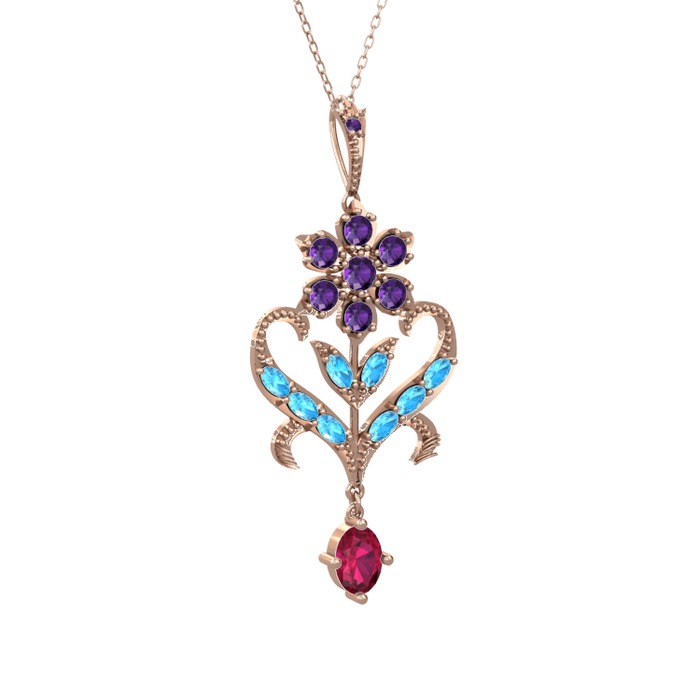 Ametist, akuamarin ve rodolit garnet 14 ayar rose altın kolye (40 cm gümüş rolo zincir)