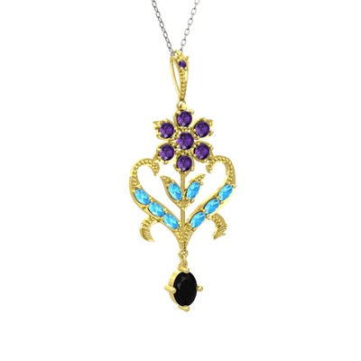 Ametist, akuamarin ve siyah zirkon 925 ayar altın kaplama gümüş kolye (40 cm gümüş rolo zincir)