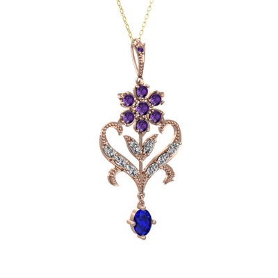 Ametist, beyaz zirkon ve lab safir 8 ayar rose altın kolye (40 cm gümüş rolo zincir)