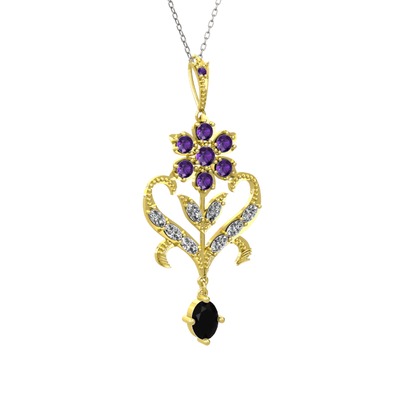 Ametist, beyaz zirkon ve siyah zirkon 925 ayar altın kaplama gümüş kolye (40 cm gümüş rolo zincir)
