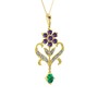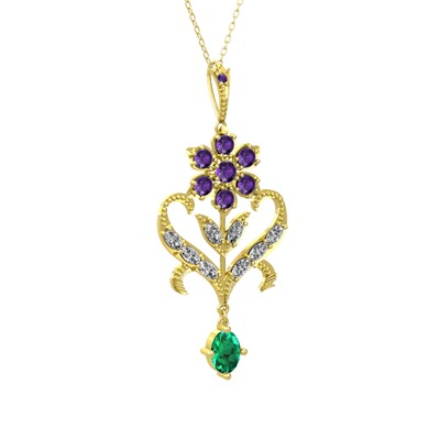 Ametist, beyaz zirkon ve yeşil kuvars 8 ayar altın kolye (40 cm gümüş rolo zincir)