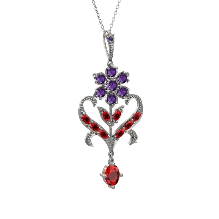 Ametist ve garnet 14 ayar beyaz altın kolye (40 cm beyaz altın rolo zincir)