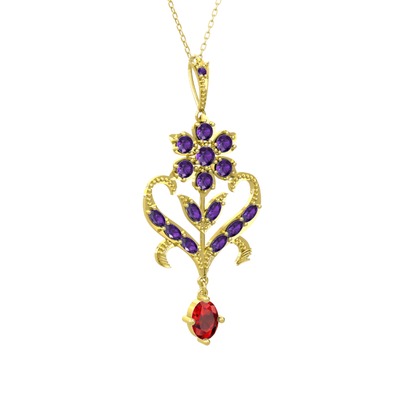 Ametist ve garnet 925 ayar altın kaplama gümüş kolye (40 cm gümüş rolo zincir)