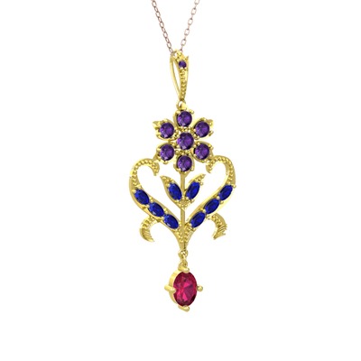 Ametist, lab safir ve rodolit garnet 925 ayar altın kaplama gümüş kolye (40 cm rose altın rolo zincir)