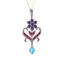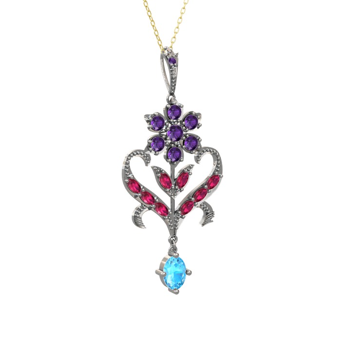 Ametist, rodolit garnet ve akuamarin 8 ayar beyaz altın kolye (40 cm gümüş rolo zincir)