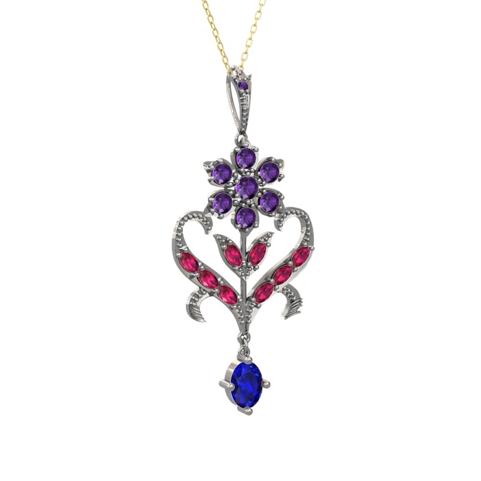 Ametist, rodolit garnet ve lab safir 8 ayar beyaz altın kolye (40 cm gümüş rolo zincir)