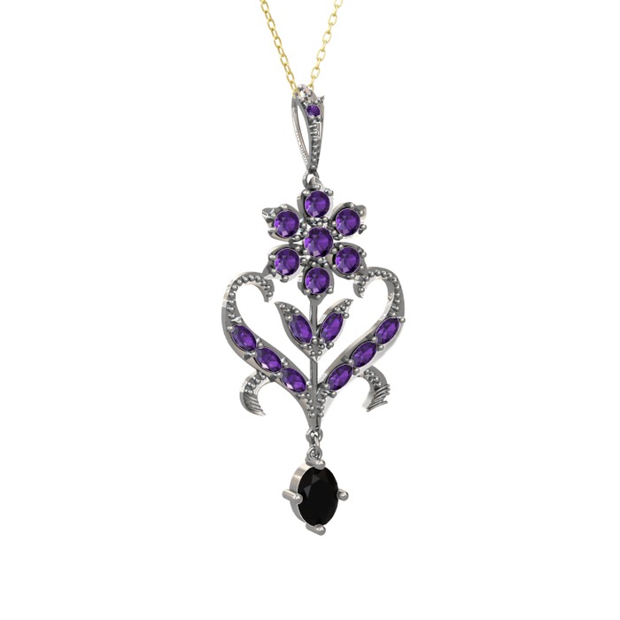 Ametist ve siyah zirkon 14 ayar beyaz altın kolye (40 cm gümüş rolo zincir)