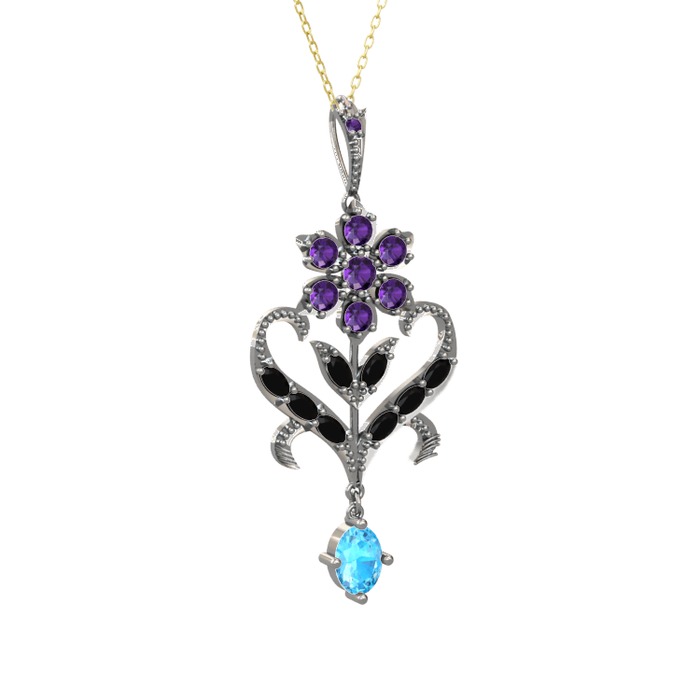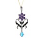 Ametist, siyah zirkon ve akuamarin 14 ayar beyaz altın kolye (40 cm gümüş rolo zincir)