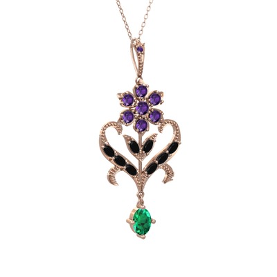 Ametist, siyah zirkon ve yeşil kuvars 8 ayar rose altın kolye (40 cm rose altın rolo zincir)