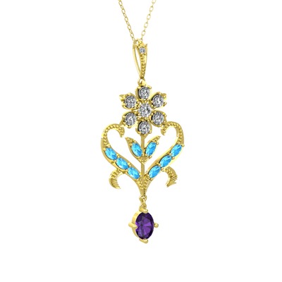 Beyaz zirkon, akuamarin ve ametist 8 ayar altın kolye (40 cm altın rolo zincir)