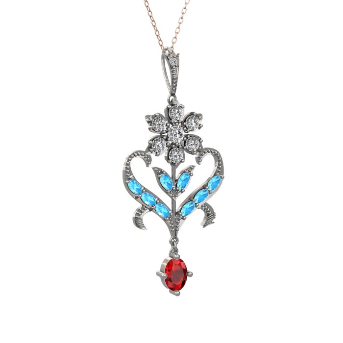 Beyaz zirkon, akuamarin ve garnet 14 ayar beyaz altın kolye (40 cm rose altın rolo zincir)