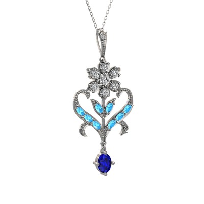 Beyaz zirkon, akuamarin ve lab safir 14 ayar beyaz altın kolye (40 cm beyaz altın rolo zincir)