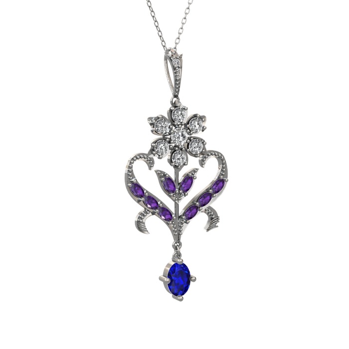 Beyaz zirkon, ametist ve lab safir 14 ayar beyaz altın kolye (40 cm gümüş rolo zincir)