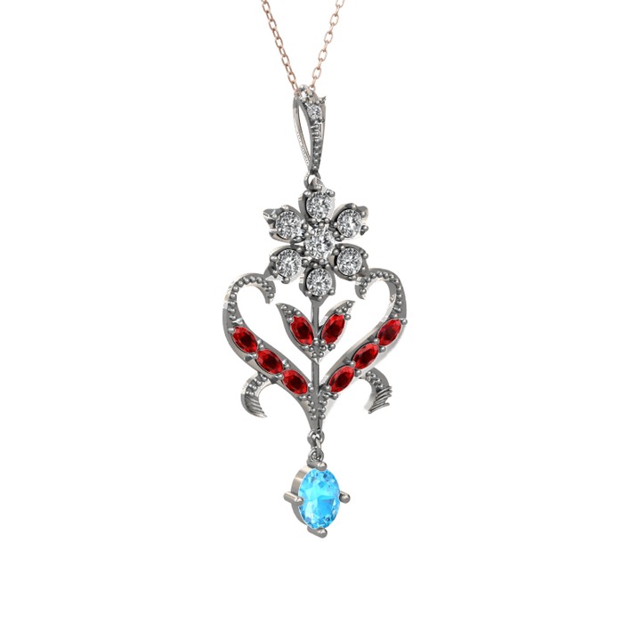 Beyaz zirkon, garnet ve akuamarin 14 ayar beyaz altın kolye (40 cm rose altın rolo zincir)