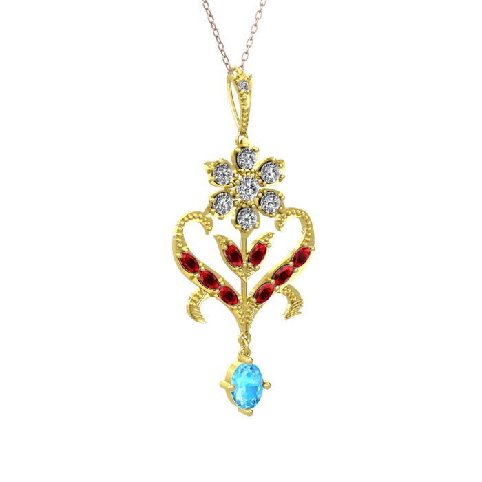 Beyaz zirkon, garnet ve akuamarin 925 ayar altın kaplama gümüş kolye (40 cm gümüş rolo zincir)