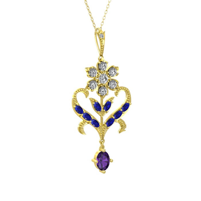 Beyaz zirkon, lab safir ve ametist 925 ayar altın kaplama gümüş kolye (40 cm altın rolo zincir)