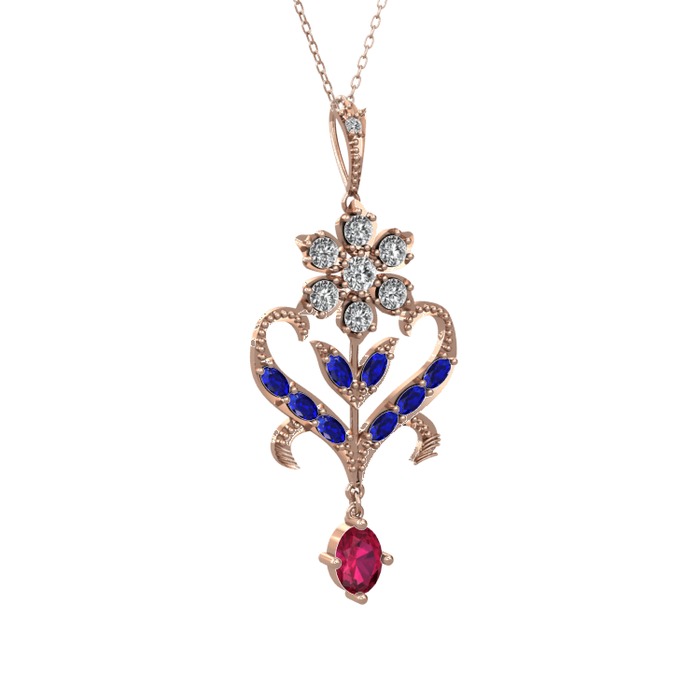 Beyaz zirkon, lab safir ve rodolit garnet 14 ayar rose altın kolye (40 cm gümüş rolo zincir)
