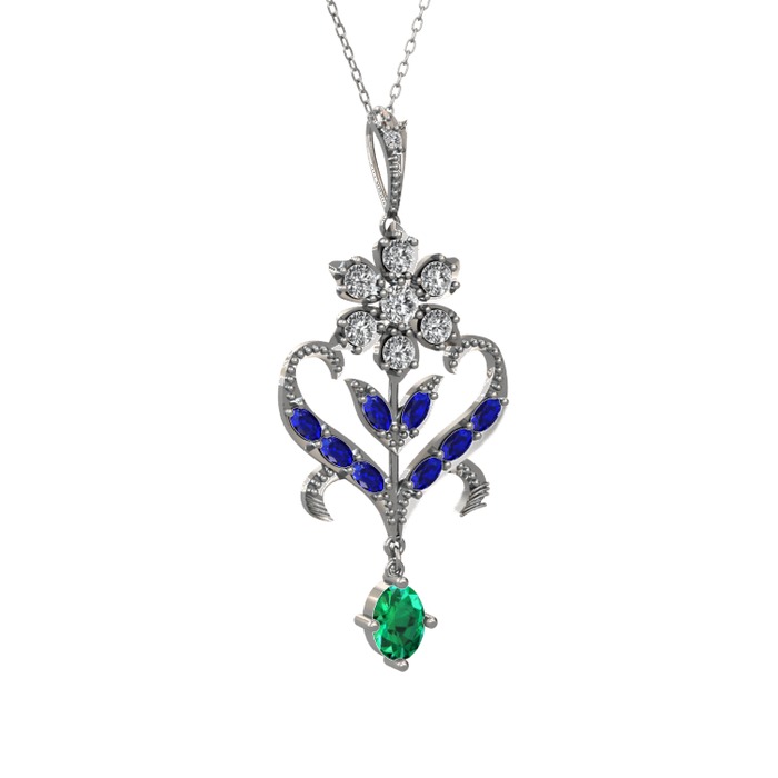Beyaz zirkon, lab safir ve yeşil kuvars 14 ayar beyaz altın kolye (40 cm beyaz altın rolo zincir)