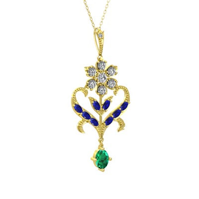 Beyaz zirkon, lab safir ve yeşil kuvars 8 ayar altın kolye (40 cm gümüş rolo zincir)