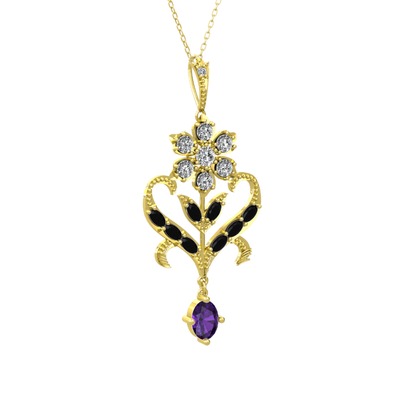Beyaz zirkon, siyah zirkon ve ametist 8 ayar altın kolye (40 cm altın rolo zincir)