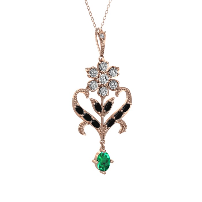 Beyaz zirkon, siyah zirkon ve yeşil kuvars 8 ayar rose altın kolye (40 cm rose altın rolo zincir)