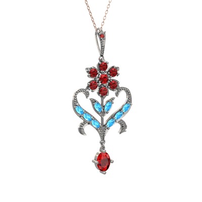 Garnet ve akuamarin 14 ayar beyaz altın kolye (40 cm rose altın rolo zincir)