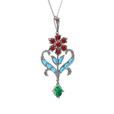 Garnet, akuamarin ve yeşil kuvars 925 ayar gümüş kolye (40 cm gümüş rolo zincir)