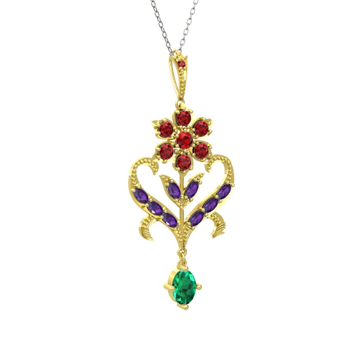 Garnet, ametist ve yeşil kuvars 8 ayar altın kolye (40 cm gümüş rolo zincir)